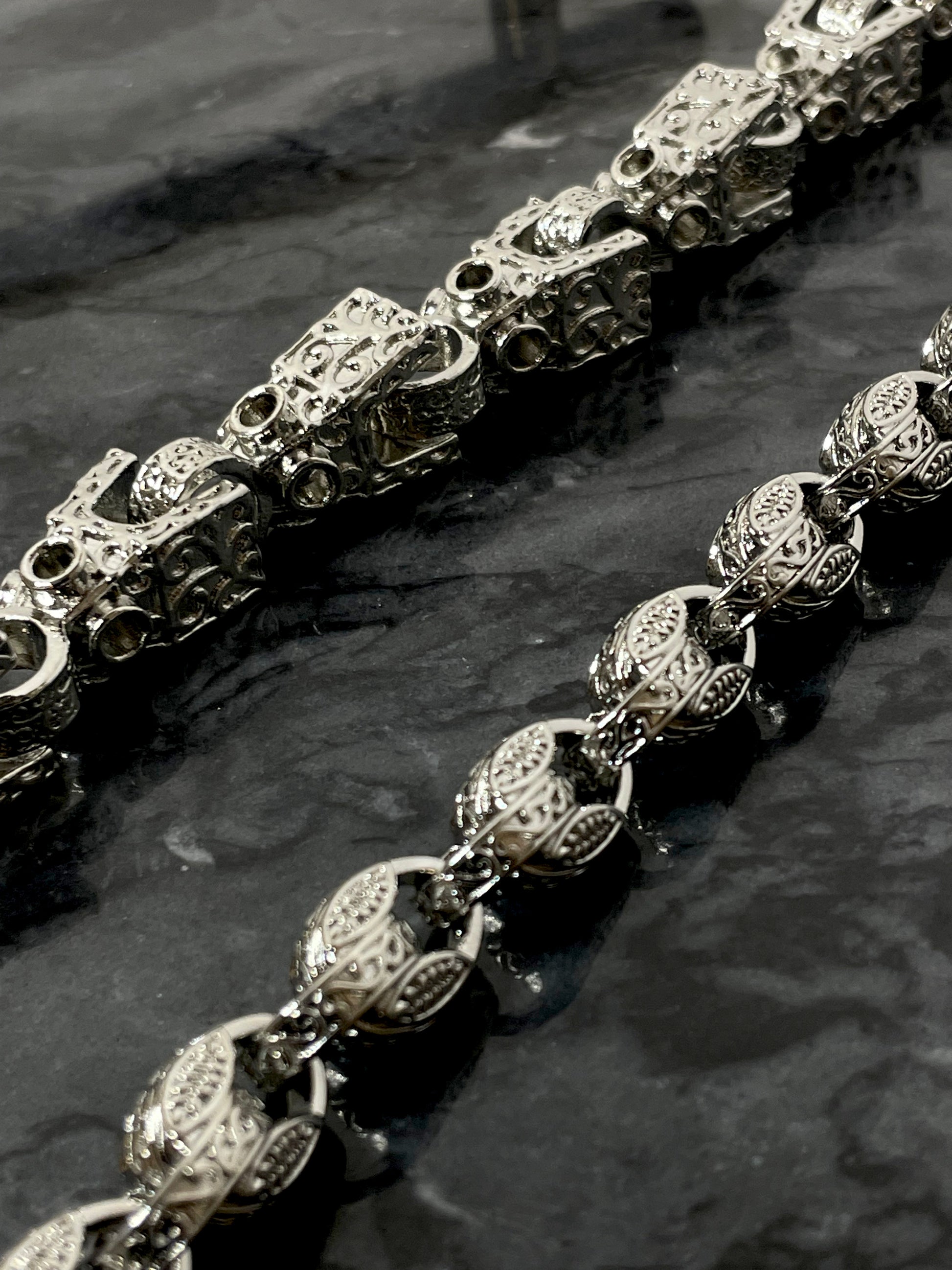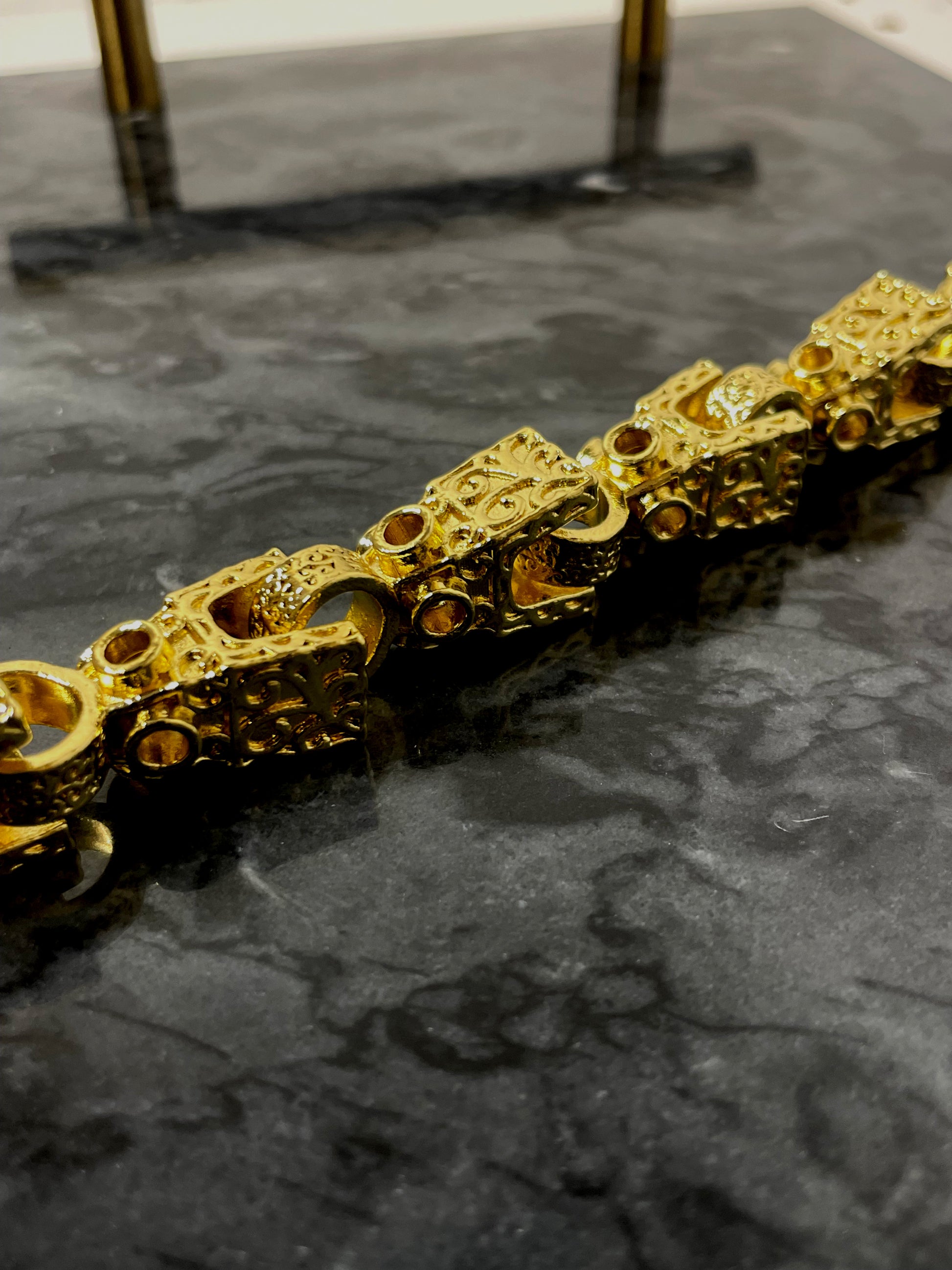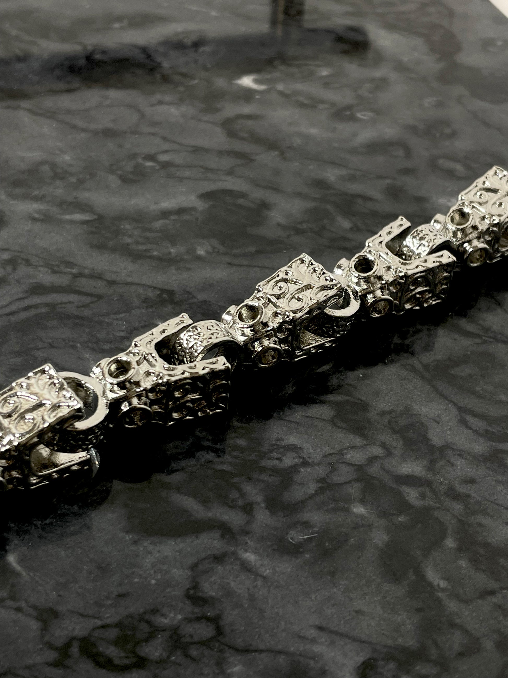 Featuring chunky, interlocking brick-style links, each bracelet is expertly crafted in your choice of 9ct solid gold, gold-dipped bronze, or 925 sterling silver, combining playful design with bold luxury. Hallmarked in the UK for quality assurance, this bracelet brings heavyweight style with streetwear credibility.