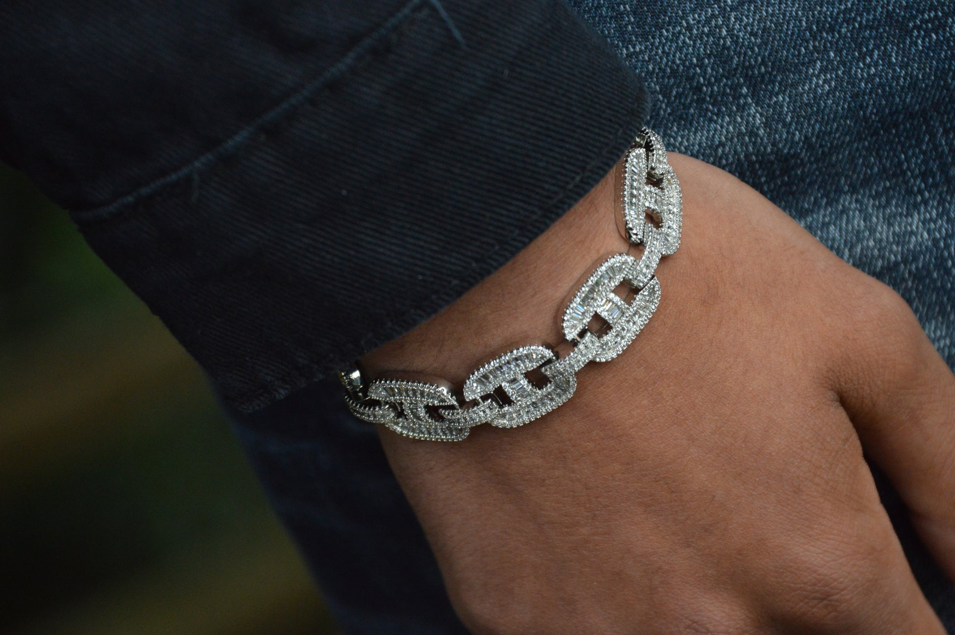 Gold plated bracelet St Tropez, PVD vacuum plated in 18k gold and white gold. Unique Baguette shaped cubic zirconia gems 3AAA premium gems. One of our finest bracelets.